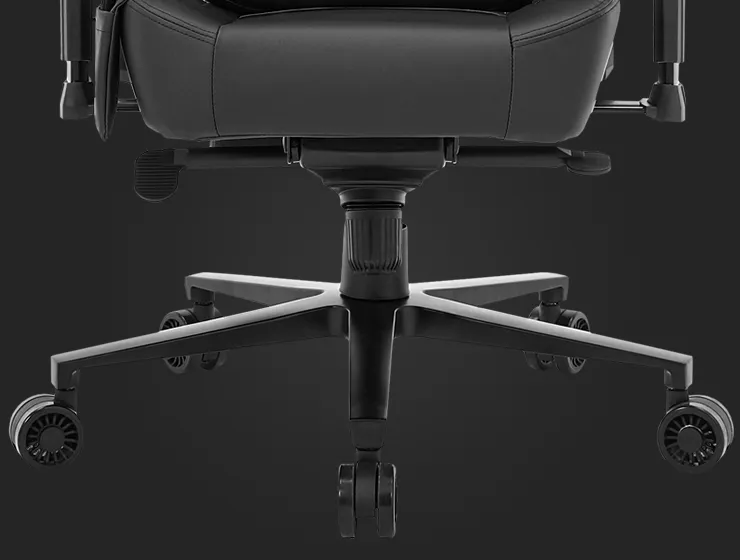 Всю конструкцию кресла Impulse удерживает пятиконечное основание, которое выполнено из алюминия и окрашено в черный цвет. Кресло легко и практически бесшумно передвигается по любым поверхностям благодаря использованию 75 мм полиуретановых колес. Они не повреждают напольное покрытие, а также обеспечивают плотное сцепление, стабильность и неподвижность тогда, когда тебе требуется сосредоточить внимание на игре или плавность и легкость передвижения в те моменты, когда ты захочешь переехать.